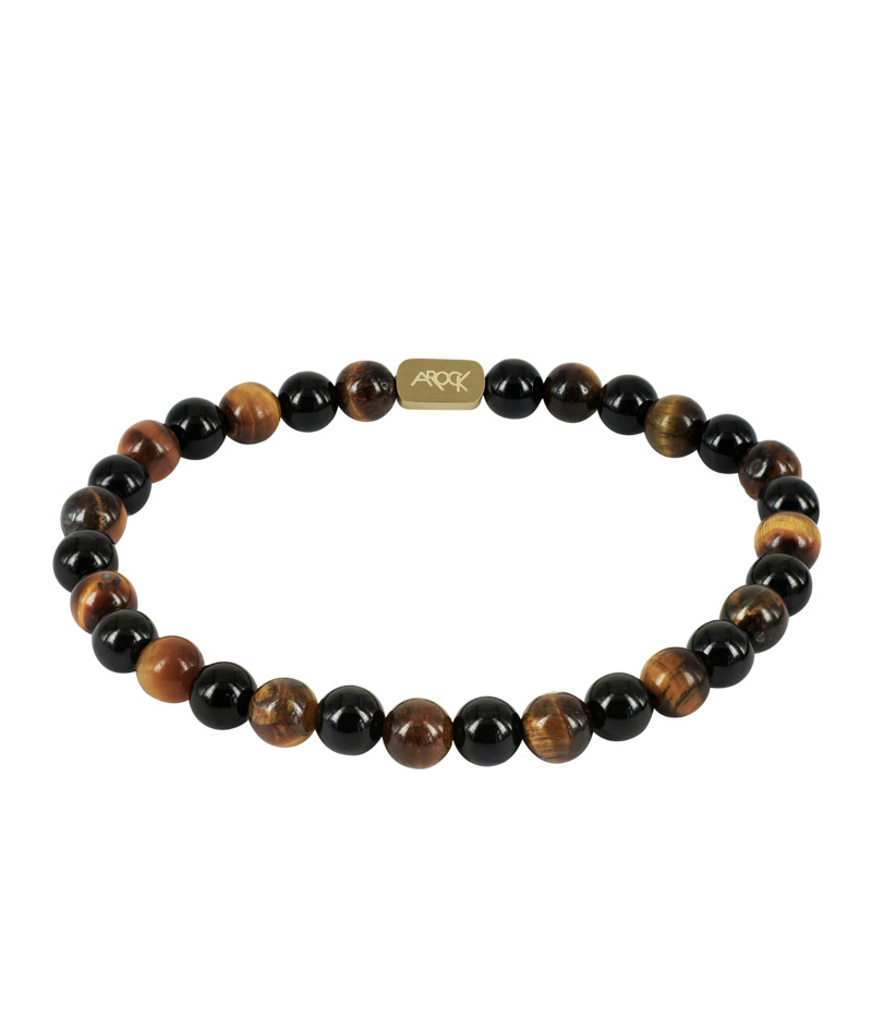 Elastisk armbånd med perler av edelstenene tigerøye og onyks. Detaljer i kirurgisk rustfritt stål.