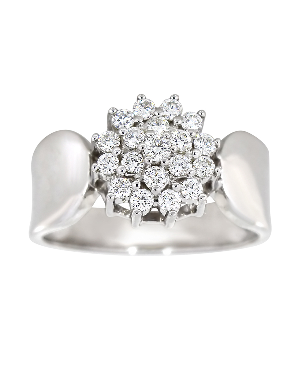 Denne diamantringen i 14 karat gull skiller seg ut med en kompakt rosett topp, der briljantslipte diamanter er plassert tett i flere nivåer for maksimal glans. Det brede båndet gir ringen et kraftfullt preg og sørger for god balanse til den detaljerte toppen. Modellen leveres enten i gult eller hvitt gull, slik at du kan velge den utgaven som passer best til din stil.