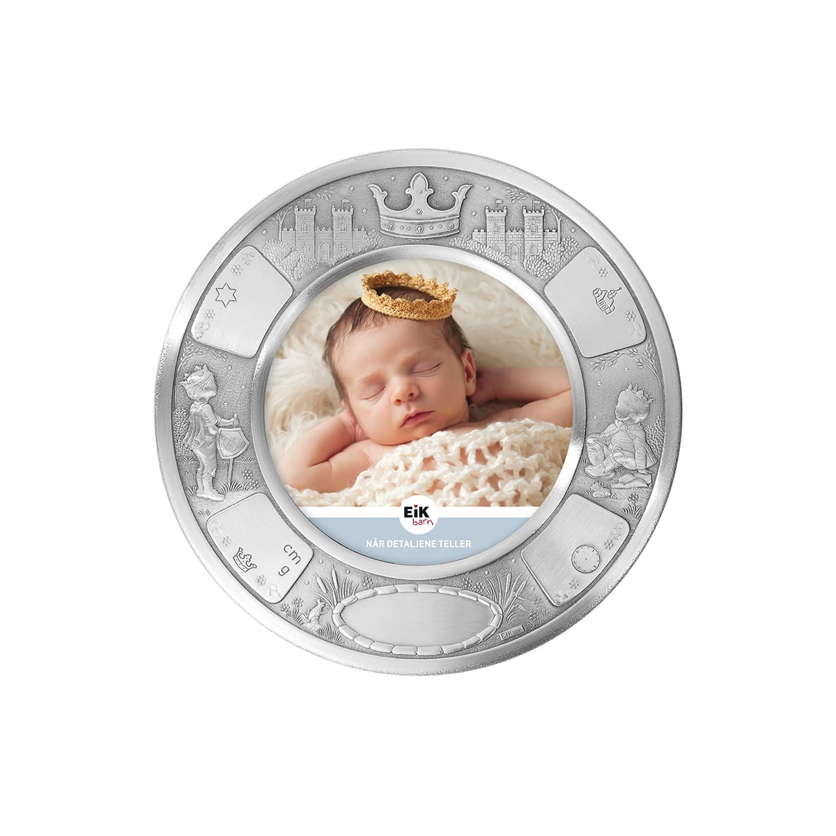 Rund fotoramme i ekte tinn med prinsemotiv. Felter til gravering av alle fødsels- og dåpsdata.