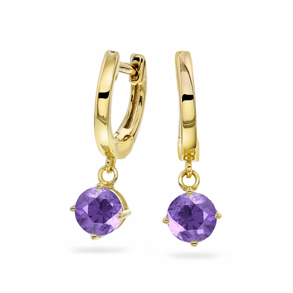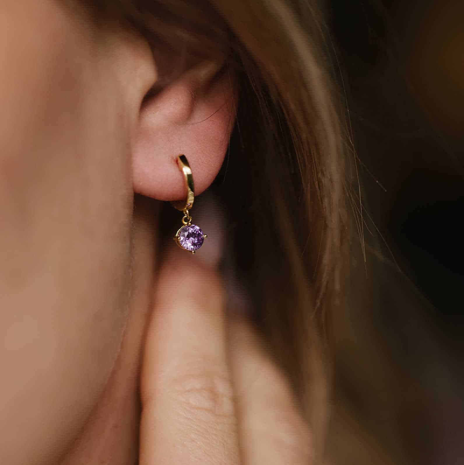 Ørepynt i forgylt sølv med lilla zirkonia.
